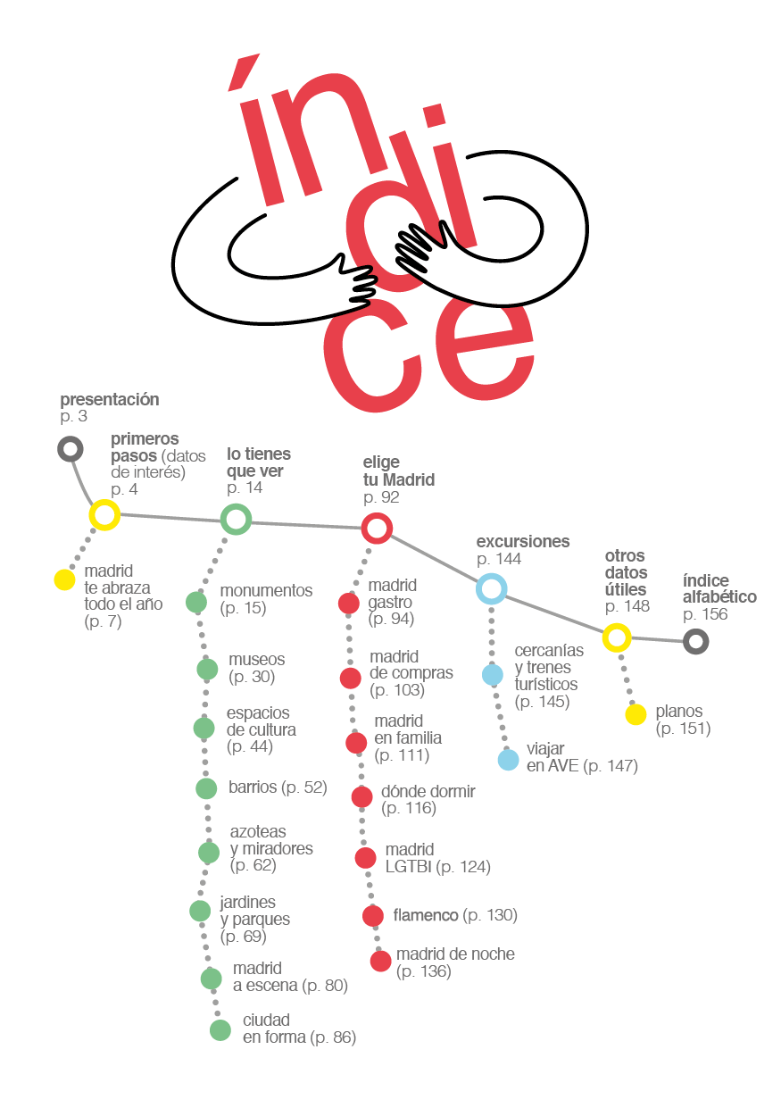 Realizamos la guia turistica para la comunidad de Madrid, utilizando una estructura de bloques mediante diferentes colores según el contenido, para que fuese fácil de buscar y leer. Se emplearon muchos recursos gráficos para hacerla más amena y numeroso ladillos explicativos, acompañado todo ello con unas ilustraciones personizadas de cada punto de interés, quedando así un resultado muy colorido y llamativo.